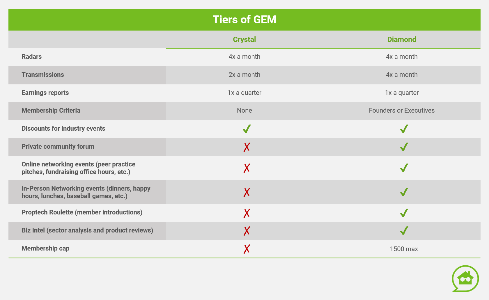There are effectively now two tiers of GEM: Crystal and Diamond. A comparison is here (can also be seen on our about page detailing the what and who):