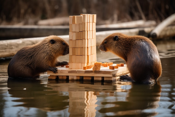 Description: Beaver animals building a wooden skyscraper