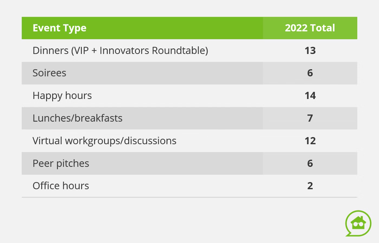 Our VIP Dinner series continued in partnership with Resident with two dinners (April during Inman and October during CREtech). The Seattle founders dinner, which Plunk hosted at its corporate HQ, was a personal highlight given it was the first “proper” Seattle-area dinner in our hometown. Another noteworthy event: Our largest dinner of all time—42 attendees—took place during Blueprint in Vegas. I suspect we’ll top that with 60 or even 80 dinner attendees at Blueprint 2023. If you’re interested in joining us for the 2023 GEM Diamond Community Dinner during Blueprint, please join the GEM Diamond.