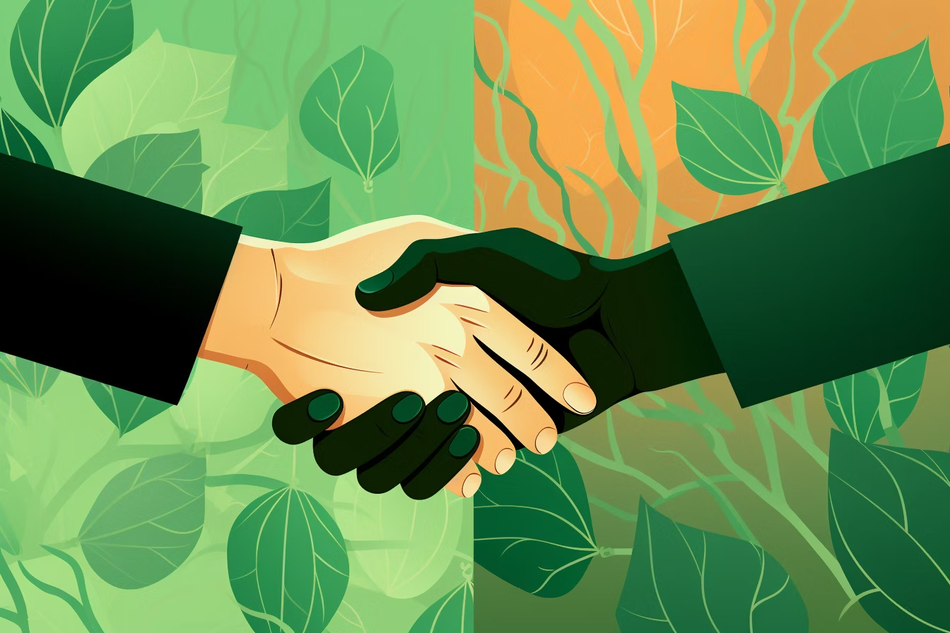 Description: Art deco illustration of hands shaking against a sustainable green background
