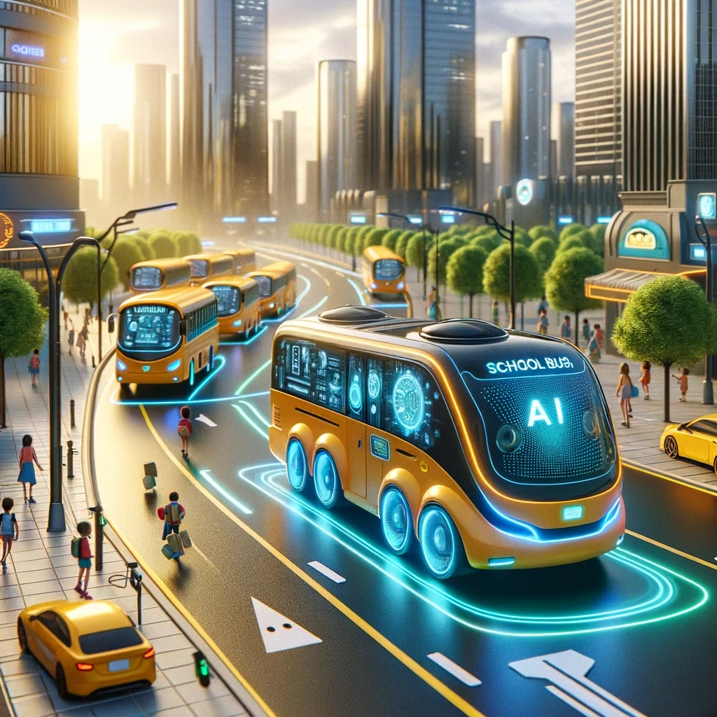 Prompt: ai-powered school buses on a predefined route