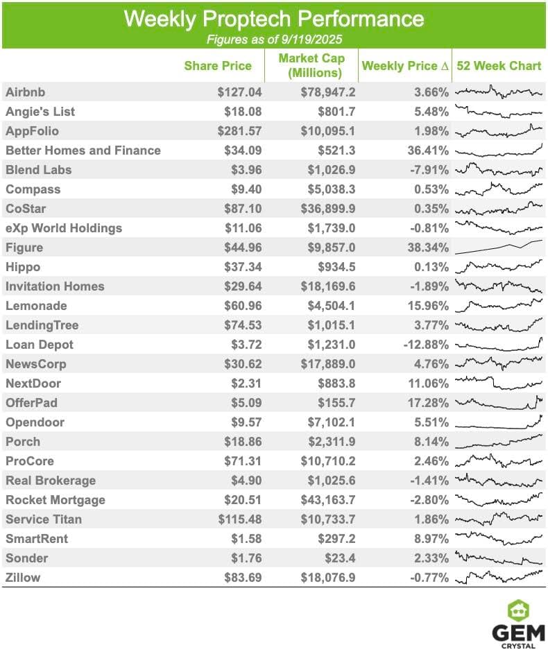 Figure was added to the PropTech Index this week, bringing the total stock count to 26. The company completed its successful IPO on September 11, 2025, raising $787.5M by selling 31.5M shares at $25 each. Figure provides home equity lending and uses blockchain technology to tokenize and trade financial assets.